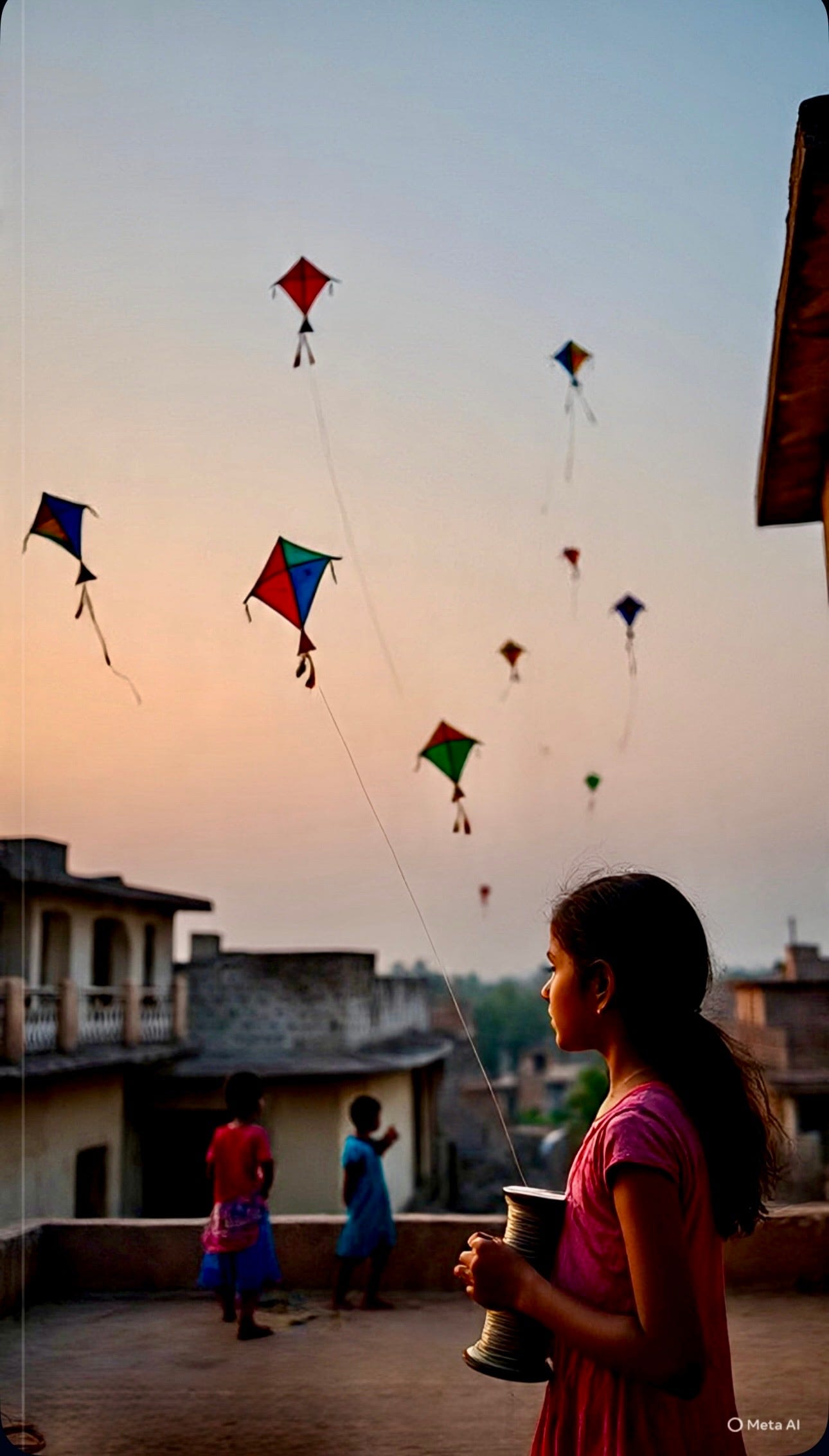 On the terrace, Pinky stood barefoot, toes gripping the cool cement as if anchoring herself to the moment. The sky was already tattooed with bold colors, diamond shapes fluttering, diving, rising. Her fingers, dusty with manja, held the spool tight, her knuckles pink from tugging, her spirit soaring higher than any kite she flew.
